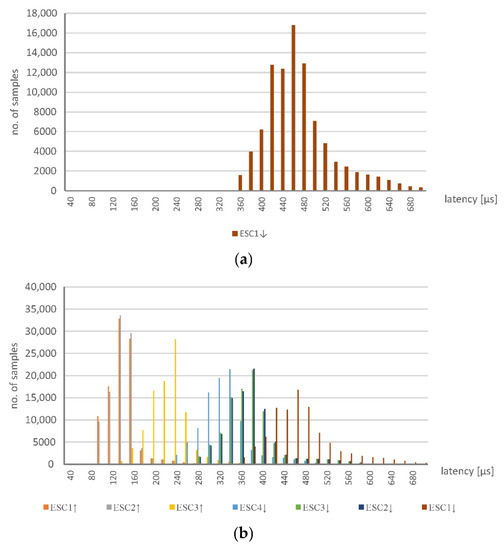 The latency of ESC1RX is calculated based on the datagrams captured with the ET2000 device at the measurement point no. 1. For every measurement point, the two Ethernet interfaces with the ET2000 probe are related. Datagrams that are received on one port are then forwarded to another port (which applies to every measurement port) and every pair of ports creates a monitoring channel. Additionally, the incoming datagrams are duplicated and sent to the monitoring port (in detail, the uplink—nineth Ethernet port of the ET2000 probe is used, while the ports of the monitoring points operate in the 100 Mbs mode and the uplink, i.e., the port with the duplicated datagrams, is a 1 Gbs port). The monitoring port is connected to the capturing device—namely, a PC with Wireshark software. The duplicated datagrams are extended by a status field (called the EtherCAT switch link), which consists of the port number that corresponds to when the datagram was received and a timestamp. For the measurement point no. 1, the calculations for the delay between receiving the datagrams from the PLC and the returned datagrams from ESC1 are determined. Other descriptions, similar to ESC1RX, are displayed in Figure 5b. They refer to the following measurements:
