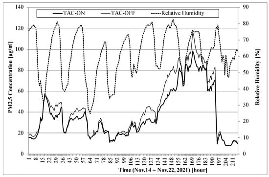 Figure 6 shows the concentration and the relative humidity of the two TAM units from 14–22 November 2021. This result demonstrates that TAC-off overestimated the PM concentration measured during night when the relative humidity was high; also, these two TAM devices showed similar results during daytime when the relative humidity was low. The difference was particularly wide when a high PM concentration occurred. In November, TAC-off overestimated by 13% on average and by 44% at the maximum.