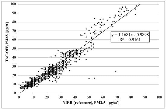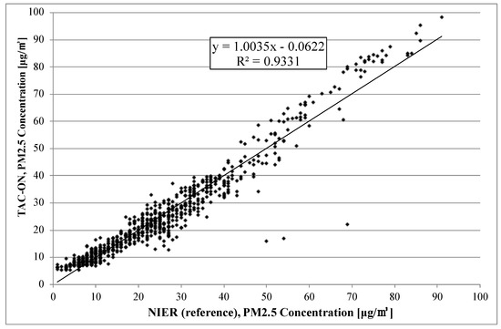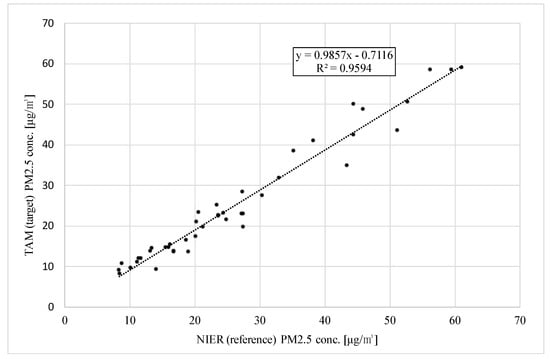 Figure 7 and Figure 8 show the correlation between the reference method (NIER) and the two TAMS: TAC is turned on in Figure 7 and off in Figure 8. For the former case, the slope of the trend line was around 1.004, and is 0.933. For the case with TAC turned off, the slope was 1.168, which is worse than that of TAC-on. However, was smaller, with a value of 0.916. The coefficient of determination determines the correlation between two measurement sets. The closer the to one, the higher the similarity of these two measurements.