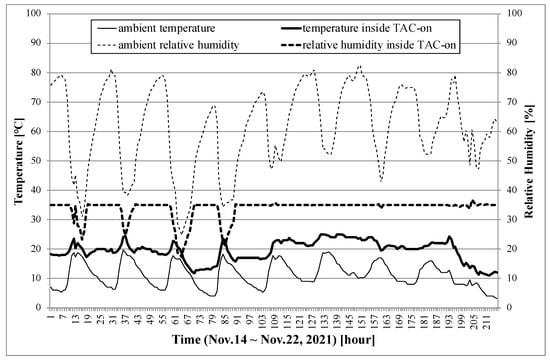 Comparison of temperature and relative humidity between inside and outside of TAC-on from 14–22 November 2021.