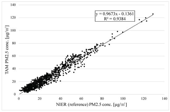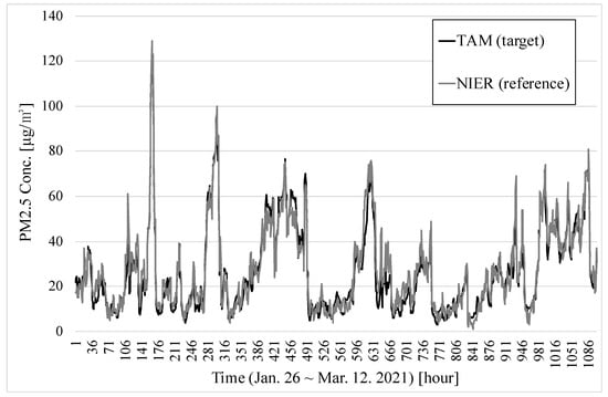Existing mechanical particle separators perform best at −2 °C [19]. As such, TAM, as a target, and a BAM, as a reference, were compared during winter from 26 January to 9 March 2021. A BAM device was used as the monitor for NIER. TAM was placed on the same site as the NIER monitor. The targets were not calibrated with the reference for this test campaign.