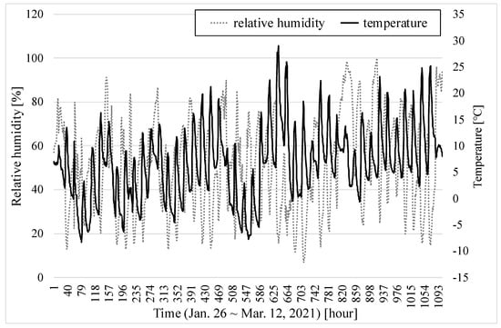 Temperature and relative humidity from 26 January to 9 March 2021.