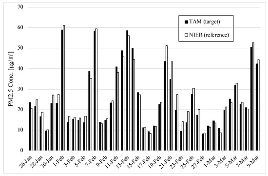 PM concentrations of TAM and the reference from 26 January to 9 March 2021.
