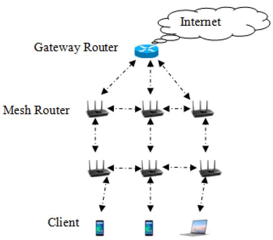 - Seyedzadegan, M.; Othman, M.; Ali, B.M.; Subramaniam, S. Wireless mesh networks: WMN overview, WMN architecture. In Proceedings of the International Conference on Communication Engineering and Networks IPCSIT, Hong Kong, China, 25–27 November 2011; Citeseer: Princeton, NJ, USA, 2011; Volume 19, p. 2. [Google Scholar]