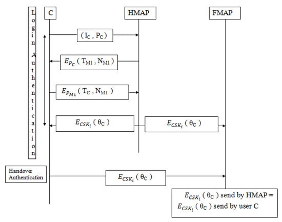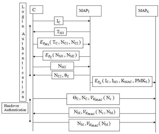 Two different authentication protocols are considered in the existing protocol: 1. To initiate mutual authentication, login authentication protocol (LAP) is considered. 2. To initiate the handover process, handover authentication protocol (HAP) is considered as shown in Figure 2. Both LAP and HAP rely on certain keys such as pairwise master key and group transient key for authentication between users and MAP. Within the network, users are offered constraint power; therefore, the exchange of these keys should be minimized. Both LAP and HAP protocols suffered from security threats. Firstly, throughout LAP the information , , and are shared in a plaintext format as →C: shown in Equation (5), C→: as shown in Equation (8) and →C: , as shown in Equation (9). As a result, an intruder could easily acquire this information and misuse it.