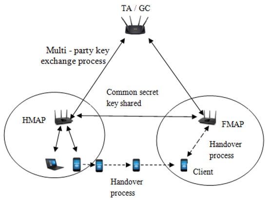 As compared to conventional networks such as LAN and MANET, wireless mesh networks (WMN) have become the most promising network presently due to their advanced features. Due to their capacity to be self-organized and self-healing, WMN are the most favorable network []. Advanced features of WMN allow continuous network access to the end-users. Three mesh entities, namely gateway routers (GW), mesh routers (MR), and mesh clients (MC) form the architecture of WMN as shown in Figure 1. Mesh routers are also called mesh access points (MAP), which forward the mesh client’s request to the gateway router (GW) for Internet access [,,,]. Due to the non-static nature, mesh clients can change their position from a home mesh access point to a foreign mesh access point. As a result, a secure handover authentication process should be carried out among mesh entities. Successful authentication during handover permits the client to join and access the Internet under a foreign MAP [,,]. In the past, numerous protocols were proposed for handover authentication that are based on tickets [,]; however, they came up with certain issues and limitations, which are discussed in Section 2. The proposed multi-party key exchange protocol presented in this paper offers the privacy of the transfer ticket. Our proposed multi-party key exchange protocol is an extension of the Diffie–Hellman protocol []. The privacy of a transfer ticket is preserved throughout the login authentication process (LAP) and handover authentication process (HAP) among the mesh entities. The protocol does not require any MAC key generation and master key generated from the AS, as it was required in the existing protocols. Mostly in existing protocols, the transfer ticket is issued by the authentication server (AS), but in our proposed work, it is issued by the mesh access point (MAP) within one hop; therefore, the presence of the AS is not considered in our proposed protocol throughout the handover process.