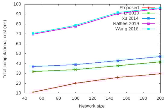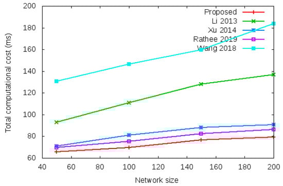 Total computational cost of proposed protocol vs. existing protocols with different network size of 50, 100, 150, and 200 nodes during login authentication process.