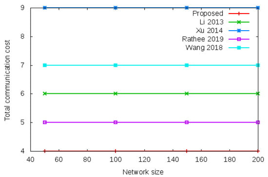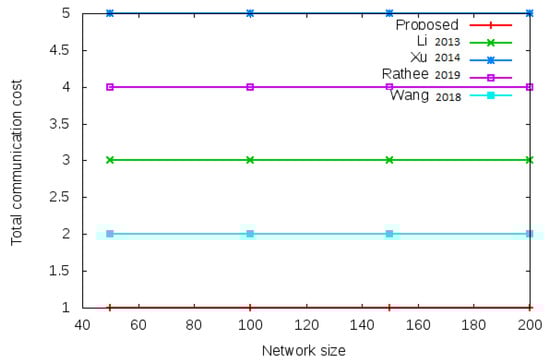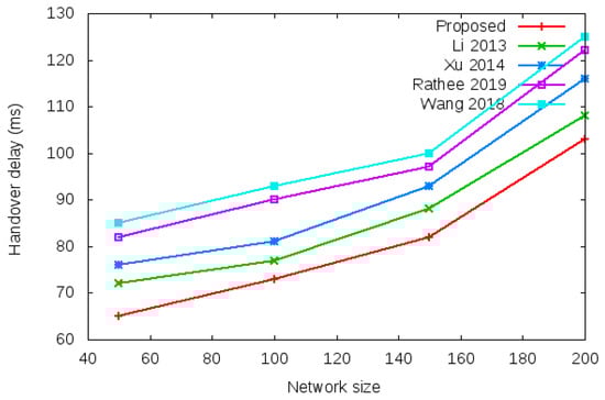 Handover delay of proposed protocol versus existing protocols with a different network size of 50, 100, 150, and 200 nodes based on total computational cost and total communication cost during the handover authentication process.
