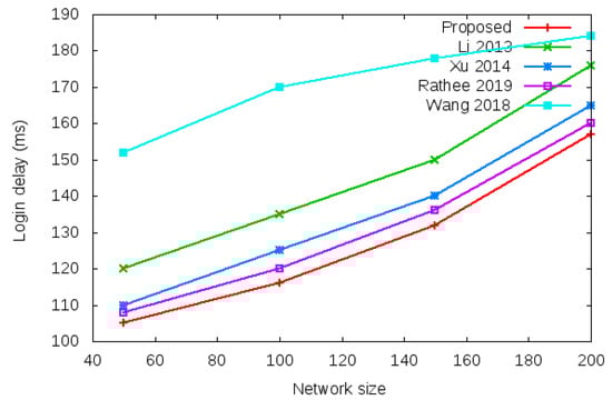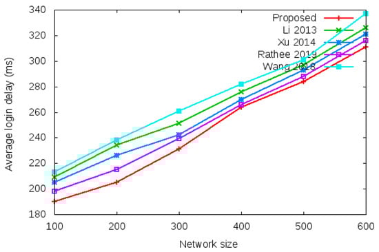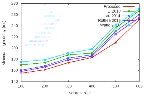 Table 5 and Figure 11 show the results of minimum login authentication delay with the network size of 100 to 600 mobile clients.
