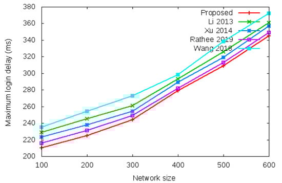Table 7 and Figure 13 show the results of maximum login authentication delay with the network size of 100 to 600 mobile clients.