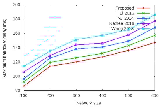 Table 10 and Figure 16 show the results of maximum handover authentication delay with the network size of 100 to 600 mobile clients.
