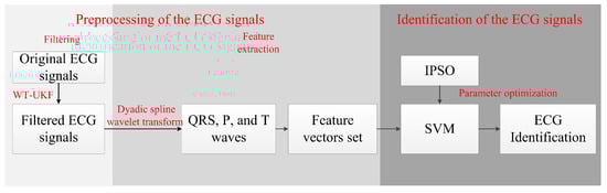 This paper proposes an ECG signal identification method based on multi-scale wavelet transform combined with the unscented Kalman filter algorithm (WT-UKF) and the improved particle swarm optimization support vector machine (IPSO-SVM). The following methods are used in the preprocessing of the ECG data: first, the WT-UKF method is used to filter ECG signals. While eliminating the noise interference, it greatly preserves the local characteristics of the ECG signals. Then, the dyadic spline wavelet transform is used to extract the feature points of QRS complex waves, and windowed processing is applied to eliminate the interference of the peak points of R waves, and extract feature points of P and T waves. Finally, composed of the obtained feature points, 22 feature vectors characterize the ECG signals and reduce the ECG data dimension for identification. In ECG signal identification, this paper uses the support vector machine (SVM) method, which is more effective on the small sample training set, and uses the IPSO algorithm to optimize the parameters of SVM, allowing the SVM classifier to determine the parameters independently and prevent the occurrence of the local maximum, making the classification as accurate as possible. The system flow diagram of this paper is shown in Figure 1.