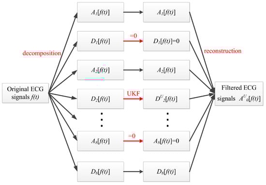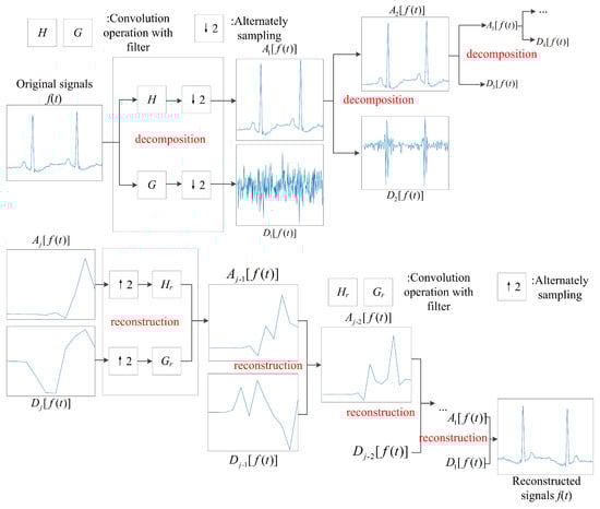 Clinically, the characteristics of ECG signals can mainly be found in the amplitudes of different peaks and intervals of P waves, QRS complex waves, and T waves. However, the noise in ECG signals directly affects the detection accuracy of P, QRS, and T waves, and the features of P, QRS, and T waves exist in different frequency ranges. Therefore, ECG signal preprocessing needs to be carried out simultaneously in frequency and time domains. Wavelet transform (WT) is a time–frequency localization analysis method with a fixed window area, but a variable time window and frequency window, and it has self-adaptability to signals. Multi-scale decomposition and reconstruction based on the Mallat algorithm is particularly suitable for the multi-scale filtering of ECG signals [].