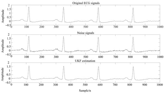 The traditional KF linear filtering framework is not suitable for typical nonlinear data such as ECG signals, while the unscented Kalman filter [] (UKF) algorithm uses unscented transformation to deal with the nonlinear transfer problem of mean and covariance, which avoids the error caused by the linearization process. Meanwhile, the conventional KF linear filtering framework was applied to achieve filtering processing. Taking the ECG signals of a subject as an example, the filtering effect is shown in Figure 4.