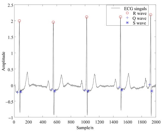 The extraction of the ECG signal feature point is mainly affected by power line interference and baseline wander interference. Power line interference energy is mainly concentrated at about 60 or 50 Hz, and baseline wander energy is mainly concentrated in the 0–1 Hz range [].