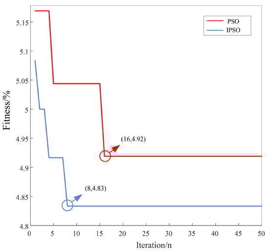 In the IPSO algorithm in this paper, in terms of Equations (6) and (7), various parameters were tested many times; the maximum number of iterations was 50, the population size was 20, was 0.9, was 0.4, is 2, and was 0.5. The value of c was initialized to 10 and the value of g to 2. In summary, the SVM classification accuracy was selected as the fitness function.