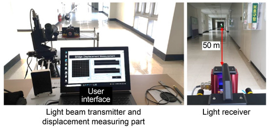 Section 3, the laser transmitter and data receiver were installed 50 m from the light receiver, and the automatic zero-point adjustment device enabled measurement from the sensor’s center. From the ground, the height of the light receiver was 4 m. The sampling frequency for measuring the displacement was set to 300 Hz. During the field test, vertical displacements of the bridge were measured.