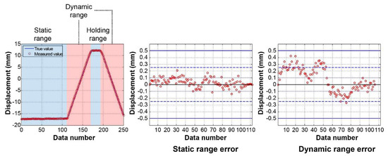 To analyze the error according to state, we divided the data into (i) a static range where the stage statically waited, and (ii) a dynamic range where its movement was controlled. Regarding the X-axis control, the error was significantly small when statically waiting. The mean and standard deviation of the errors 0.01 mm and 0.01 mm, respectively, and the maximum error was 0.03 mm. Conversely, an error occurred while moving the light source because the lower frame and tripod moved from the recoil when the Motorized Stage was controlled. As shown in the error values, the signal values are created in the same direction as the Motorized Stage’s movement, forming a sine wave shape. Hence, the mean and standard deviation of the errors were 0.18 mm and 0.10 mm, respectively, and the maximum error was 0.36 mm.