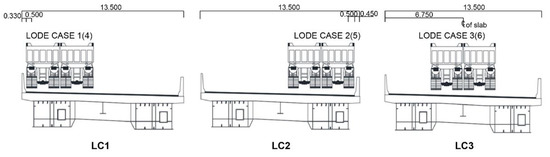The tests can be categorized into static and dynamic loading tests based on the loading method. In the former, to investigate the static behavior characteristics in response to external forces, the engine of the test vehicle was turned off at the measurement point and we waited approximately a minute before measurement. Regarding the measurement positions, in principle, the load is applied to where the maximum bending moment and shear force occur. Accordingly, the test vehicle was moved to different positions for each load case (LC1, 2, 3), as shown in