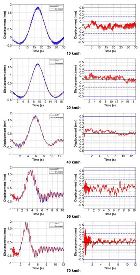 Table 2. For the dynamic loading test, we analyzed the errors at the points with the maximum load. The average error of the signals overall was less than 0.07 mm, and the standard deviation was less than 0.05 mm. Moreover, a comparison of values where bridge displacement was most significant in the dynamic loading test showed that the error was less than 0.1 mm except for the second signal (20 km/h). The error was highest at 20 km/h, but gradually decreased as further tests were carried out. This was considered to be due to noise caused by external factors beyond our control, such as EMI noise. Furthermore, it could be regarded that the amplitude of the error was not related to the speed of the test vehicle because even if the speed was high, the resulting bridge behavior was slow enough to be measured using our Wi-Fi module. In addition, instability induced by the vehicle speed did not affect the development sensor system. Comparing the signal comparison and error analysis results, it is evident that the developed sensor system can accurately and precisely measure the bridge displacement.