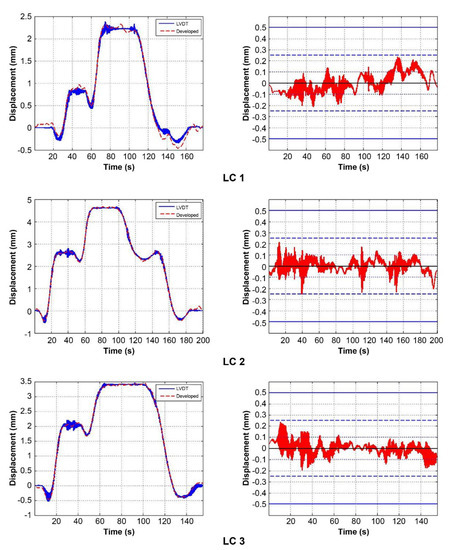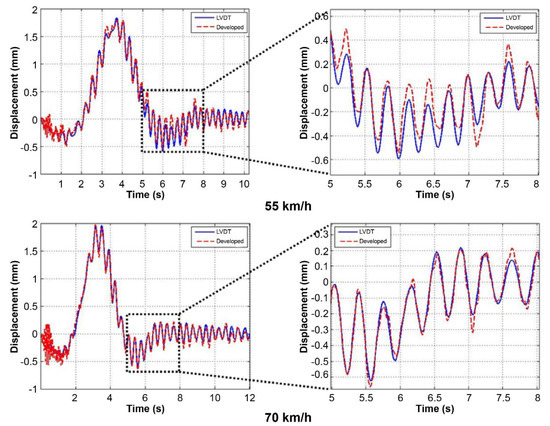 Figure 11 show signal comparisons of the existing and developed sensors for each test, and the results show that the developed system can measure bridge displacement with high accuracy.