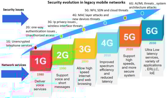 Moreover, NFV services migrate from one resource to another, presenting security issues. There are additional privacy issues related to many application scenarios and services types that 5G networks enable. Due to the 5G platform’s open nature, users’ private information is easily disclosed to the open state [39,40]. The privacy issues connected with 5G will undoubtedly become a problem in the future years that must be addressed and solved [41]. The CN of 5G consists of different functionalities. Networks are becoming more dynamic than ever due to NFV, SDN, and cloud technologies, resulting in many threats and vulnerabilities. The more devices and services that exceed the signaling load, the higher the new 6G applications’ criteria and greater network capacity than presently established 5G networks will be [42]. New 6G applications will have more criteria and need greater network capacity than presently established 5G networks [42]. Additionally, they have a significant impact on 6G operations. Therefore, security measures guarantee service continuity and quality in ERLLC [43]. Additionally, the latency effect due to security processes will be addressed. Effective security solutions are considered high requirements to ensure service and resources’ availability and continuity. Figure 2 summarizes the evolution and security issues from 1G to 6G.