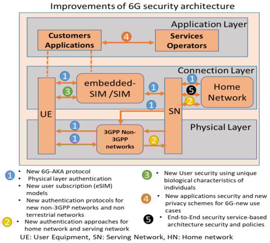 6G security architecture will need to adapt to enable new applications and the integration of the space–air–ground–sea network model. The current 3GPP security architecture might need some significant changes, as depicted in Figure 3. Network operators will be critical players to upgrade network access and security architecture. The service providers provide value-added services (online entertainment) and platforms (cloud storage, data analytics) to developers and users. Service providers will upgrade application domain and service-based architecture security. XR/AR game developers will have to increase security for cloud/edge applications or enable new security APIs (following third-party providers’ services). 6G networks may offer mobile storage and other services. Thus, they can help improve service security in many ways. Finally, users may be unaffected by the modifications if they swap devices or register new SIM cards. The security architecture of 6G can be divided into layers to cover all security issues and challenges for all 6G entities. It consists of the physical layer, connection layer, and application layer. Each layer enhances new security functions that can improve the security of the 6G networks. Figure 3 summarizes the improvements of 6G architecture components and layers. It represents the security improvements of the 6G architecture.