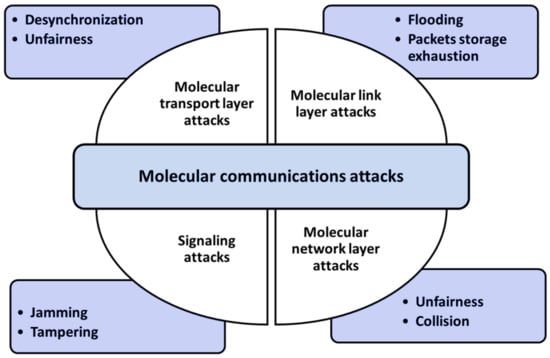 - Loscri, V.; Marchal, C.; Mitton, N.; Fortino, G.; Vasilakos, A.V. Security and privacy in molecular communication and networking: Opportunities and challenges. IEEE Trans. Nano Biosci. 2014, 13, 198–207. [Google Scholar] [CrossRef] [PubMed]