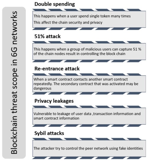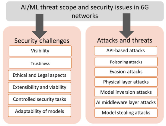 By 2020, fifth-generation (5G) radio networks had been implemented globally, with features such as mass connection, extreme dependability, and guaranteed low latency specified [1]. 5G, on the other hand, will fall short of meeting all future needs beyond 2030. Sixth generation (6G) wireless network technology is predicted to offer higher coverage, less energy consumption, comprehensive spectral, and cost-effectiveness with improved security. 6G networks will meet these needs by deploying new technologies such as multiple accesses, waveform design, channel coding schemes, network slicing, numerous antenna technologies, and cloud edge computing. 6G affects four significant future changes [2]. First, it offers an integrated air–ground–space–sea communication network by deploying terrestrial and non-terrestrial networks [3]. Second, new radio bands will improve network traffic capacity and data speed, including millimeter-wave (mm-wave), sub-6 GHz, terahertz (THz), and optical communications. Third, 6G will enable a new generation of intelligent applications and services using artificial intelligence (AI) and big data technologies in response to the massive datasets generated by heterogeneous networks with different communication scenarios, wide bandwidths, a higher number of antennas, and new 6G applications’ requirements [4,5,6,7]. Fourth, network security and privacy must be strengthened and enhanced for 6G technologies and applications [8]. This paper presents the 6G security trends and challenges of other upcoming technologies and applications. Data processing, threat detection, traffic analysis, and data encryption are considered the most critical issues in 6G networks. The security issues due to massive traffic processing can be solved using decentralized security systems, in which the traffic can be handled dynamically and locally. 6G use cases impose stricter security requirements than 5G use cases [9,10]. The Internet of Everything (IoE), with a wide variety of capabilities and services, will make it more challenging to operate and install distributed AI, privacy, and security solutions. The high mobility conditions of the new connected devices make them change their interconnected networks and require services from other networks, resulting in security complications and privacy problems.