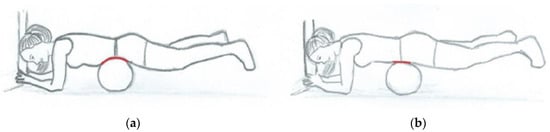 The starting position at ARB was prone. At the level of the navel, a basketball supported the body with the rest of the body in the air. The ball was fixed to the floor so that it did not move during the exercise. The participant held onto a stable object with both hands so that the weight of their legs did not overload the rest of the body and force their feet to touch the ground (Figure 1a). The abdominal muscles were relaxed so that the ball intruded into the abdominal region (see the red curve in Figure 1a). By activating the abdominal muscles, the participant pushed the ball out of the abdominal cavity so that the body rose on the ball (see the red line in Figure 1b) and reached its final position. The spine remained in a neutral position during the exercise. The target time was 1 s for raising (concentric contraction) and 2 s for lowering the body (eccentric contraction) so that there was a smooth movement, without an abrupt start.