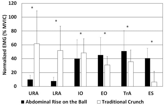 Normalized EMG values and SD for the upper rectus abdominis (URA), lower rectus abdominis (LRA), internal oblique (IO), external oblique (EO), transversus abdominis (TrA), and erector spinae (ES) muscles in an abdominal rise on a ball and a traditional crunch. * p ≤ 0.05.