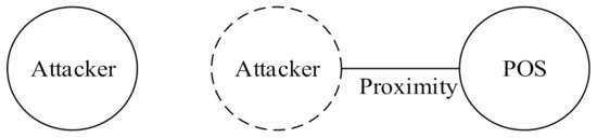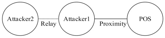 The second type of relay attack is the terrorist fraud attack [21], as shown in Figure 2. Attacker 1 relays a transaction message to Attacker 2, who is farther away, leading the merchant’s POS to believe that Attacker 1 is in close proximity, and the merchant therefore completes the transaction with Attacker 1. In this attack mode, Attacker 2, who completes the transaction, is proof that he or she (Attacker 2) is not at the purchase location, and the bank may thus have to bear the cost of consumption. However, the impact of this attack is relatively limited because the attacker must partake in all dispute-handling processes, increasing his or her identity exposure.