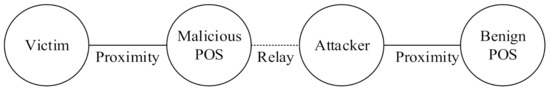 The third type of relay attack is a mafia fraud attack, which has the largest impact. As shown in Figure 3, an attacker initiates an authentication request by using the Malicious POS controlled by the attacker and a victim’s credit card. The attacker then sends information that he or she obtains to the device of another attacker who is farther away. This type of attack was first developed by Desmedt et al. [22].
