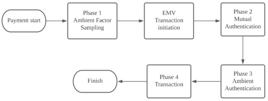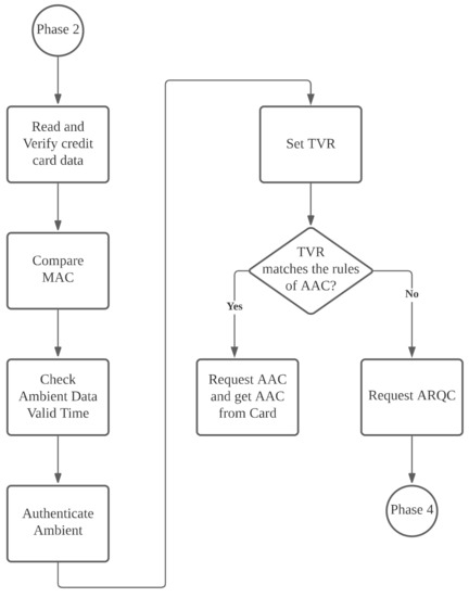 Ambient authentication involves, for example, the use of global positioning systems (GPSs), Bluetooth, Wi-Fi, audio sensors, light, or temperature sensors [35,36,37,38,39,40] in mobile phones to verify that two devices are at the same location and thus reduce the threat of relay attacks. Mehrnezha et al. compared the similarity of the accelerometer data measured when the mobile phone is used to tap the POS to ensure that both devices are at the same location [39]. However, this solution is only effective if users change the manner in which they use credit cards. Halevi et al. proposed a detection method that uses sound or light [35]; when sampling ambient factors, Halevi et al. did not account for the sound randomly generated by the POS terminal at the time or the sound used in combination with an ambient-light-sensing message. For this reason, attackers can forward a transaction message to other locations with similar ambient audio and light factors to pass authentication, or attackers can relay previously recorded ambient authentication information to bypass authentication checks. Ma et al. proposed the use of GPS to verify that a POS and credit card-linked phone are at the same location [37]. For this solution, Ma et al. did not indicate methods to integrate sensing information into EMV protocols and achieve compatibility with existing EMV protocols, nor did they prove their method to be resistant to the majority of currently known attacks on online and offline card transactions.