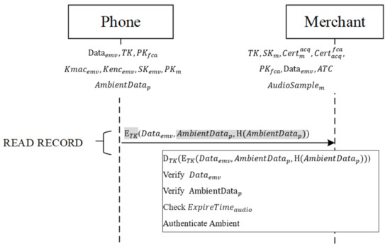 After the merchant receives from the phone, it decrypts the received message with TK, obtaining , , and SDAD. The merchant then uses the card’s public key to decrypt SDAD and verifies that its hashed value is correct. If the value is correct, the merchant sends AmbAuthResult to the issuing bank for online transaction. and AmbAuthResult are also sent for the issuing bank to verify whether the ambient factor has expired and whether it is within the valid period at the time of verification.