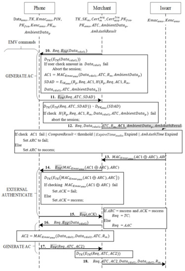 Next, the phone follows EMV’s protocol content, employing the user–issuer shared key to hash the received , the current transaction number ATC, and a random number obtained from the merchant during mutual authentication, into message AC. Finally, the phone encrypts AAC, ATC, and AC with TK and returns the encrypted message to the merchant.