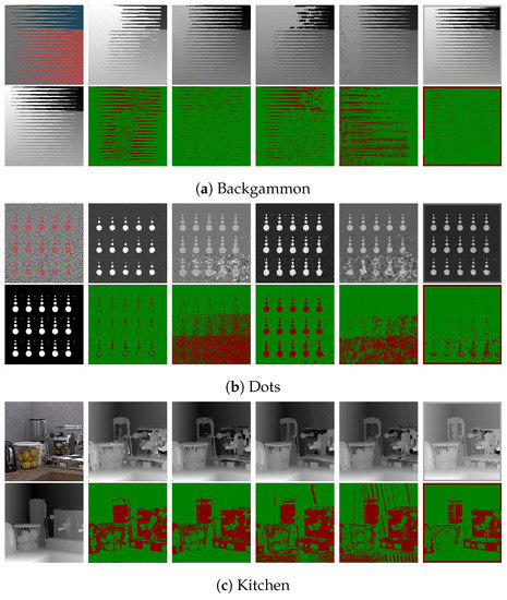 The proposed algorithm out-performs the benchmark algorithms for all images in all three criteria as shown in Table 5 and Table 6, Figure 24 and Figure 25. The algorithm from Zhang et al. [11] and Wang et al. [10] generates a disparity map that uses the maximum and minimum depth values from the ground-truth depth map to scale the disparity map accordingly. The problem with noisy images is that misdetections and outliers make the re-scaling unreliable and nontrivial. It is clear from the results shown in Table 5 and Table 6 that the accuracy of the proposed algorithm is also significantly affected for most of the images, but the algorithm is still able to estimate a depth map with comparatively high accuracy compared to the state-of-the-art algorithms. The average accuracy for our algorithm for Badpix 0.07 across the ten images used for testing shown in Figure 24 and Figure 25 is 0.75, whereas for Shin et al. [12], Strecke et al. [9], Wang et al. [10] and Zhang et al. [11] it is 0.6, 0.3, 0.26 and 0.11, respectively. For the ‘dots’, and ‘pyramids’ images the accuracy is over 95% out-performing the state-of-the-art algorithms. The images with finer details such as the ‘backgammon’ image in Figure 24a has a considerable amount of misdetections, but algorithm is still able to obtain a Badpix 0.07 value of 0.74. The ‘kitchen’ and ‘museum’ image in Figure 24c,e shows errors for transparent or reflective surfaces, but the depth map for our algorithm estimates the background and foreground region in the image accurately with Badpix 0.07 value of 0.63 and 0.69, whereas the depth map from Wang et al. [10] and Zhang et al. [11] produces errors in the background and foreground regions and Badpix 0.07 value below 0.25. Shin et al. [12], on the other hand, shows an Badpix 0.07 value 0.5 and 0.52, but large parts of the background and foreground region are misdetected. An important observation that can be drawn from Table 2, Table 3, Table 5 and Table 6 is that without the added noise the average accuracy for the proposed algorithm, Shin et al. [12], Strecke et al. [9], Wang et al. [10] and Zhang et al. [11] is 0.96, 0.9, 0.89, 0.79 and 0.86, respectively. After the noise is added to the images, our accuracy reduces to 0.75, whereas for Shin et al. [12] it reduces to 0.6, Strecke et al. [9] it reduces to 0.3, Wang et al. [10] it reduces to 0.26 and Zhang et al. [11] it reduces to 0.11.