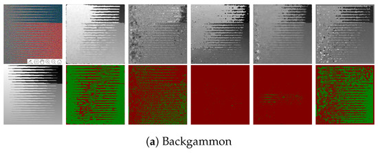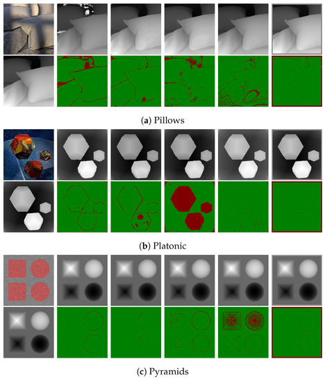 The LF images in the 4D Light Field Dataset [32] comprise 9 × 9 sub-aperture images. For the synthetic images, the images in Figure 19 and Figure 20 show the error pixels in red where depth deviates by more than 0.07 from the ground truth and the pixels in green where depth deviates by less than 0.07. Table 2 and Table 3 compares the ground truth images to the disparity maps generated by the algorithms that are being tested using the Badpix metric. The LF images generated synthetically have little to no noise compared to the real LF images, and thus the estimated depth maps have less misdetections and the depth boundaries are well defined on the synthetic data compared to the real data. Table 2 and Table 3, which are a comparison of the depth maps with the ground-truth depth map, show that the proposed algorithm out-performs the state-of-the-art algorithms in the two criteria of Badpix 0.07 and 0.03 for the ‘dots’ images from the synthetic images in the dataset. On visual inspection of Figure 19 and Figure 20, it shows that even though the noise level is increased in the bottom part of the image, the background is region is still detected accurately. For ‘medieval 2’ image, the region in the image near the window on the top left and near the door on the bottom right has a dark shadow, which is the common area misdetected for all algorithms. Shin et al. [12]’s produce the least errors around object boundary for the synthetic light field images. The ‘kitchen’ and ‘museum’ image in Figure 19c,e shows how the error pixels are in the same regions for all the estimated depth maps. The reason for the similarity is those regions in the image are either transparent or reflective surfaces. Shin et al. [12] show fewer errors around these regions as they explicitly use a mask for these type of surfaces while training their network. The depth map for our algorithm, Shin et al. [12] and Strecke et al. [9] give similar results for the background and foreground region in the ‘kitchen’ and ‘museum’ image, whereas the depth maps from Wang et al. [10] and Zhang et al. [11] produce errors in the background and foreground regions. For the ‘museum’ image in Figure 19e, and the ‘pillow’, ‘platonic’ images in Figure 20a,b, our proposed algorithm out-performs the non-CNN based algorithms at Badpix 0.03, with comparable results for the other two criteria. Out of the three images mentioned above, for the ‘museum’ image the main reason for the errors is the reflective display case and the bright display case lighting. For the ‘platonic’, ‘pyramids’ and ‘tomb’ images in Figure 20, our depth map generates error only at depth boundaries and all other regions are estimated accurately and is comparable to Shin et al. [12]’s CNN approach. Shin et al. [12] produce high accuracy depth maps and are also able to distinguish accurate depths for occlusions and smaller objects in the image, but the accuracy reduces for transparent or reflective surfaces and for noisy images.