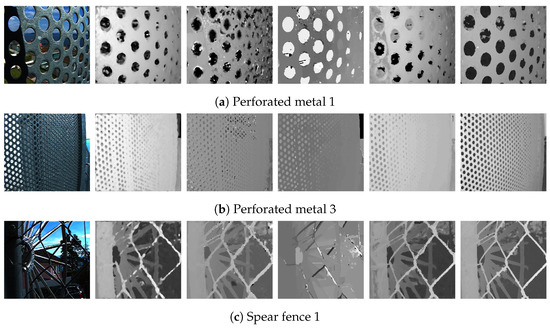 The proposed algorithm is not able to distinguish objects in the image that are less than 4 × 4 pixels in width due to the patch size used, but using patches of size less than 4 × 4 pixels drastically increases the number of misdetected depth patches and also increases the computational time. The image result displayed in Figure 21 and Figure 22 on visual inspection shows similar outcomes as for the synthetic images. The central view for four images in the Figure 21a,b and Figure 22d,e show a gradual change in depth and the depth maps correspondingly show the gradient change. For the proposed algorithm, the images in Figure 21a,c and Figure 22c with the chain fences, the regions where the chain has a shadow cast over it is misdetected. The chain fences in all three images for all the algorithms have been under or over-compensated. The lorikeet image in Figure 22e is a complex image with the leaves and branches, but the proposed algorithm performs comparatively with Strecke et al. [9] and Zhang et al. [11]; on the other hand, with Wang et al. [10] major parts of the image are misdetected. For the ‘perforated metal 1’ image Figure 22a, parts of the image in the far background and foreground are represented with less error as compared to all the other depth maps, whereas in the ‘perforated metal 3’ image Figure 22b, Wang et al. [10] better estimates the depth around the holes in the metal frame. In Figure 21 and Figure 22, misdetections can been seen for textureless regions for the ‘backlight 1’ image Figure 21b, the ‘perforated metal’ image Figure 22a, and the ‘university’ image Figure 22d, i.e., the regions of the image with the sky.