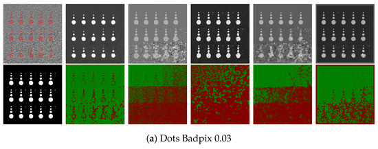 Visual comparison of the ground truth with the proposed algorithm, Strecke et al. [9], Wang et al. [10], Zhang et al. [11] and Shin et al. [12] for dots image for Badpix 0.03 and 0.01.
