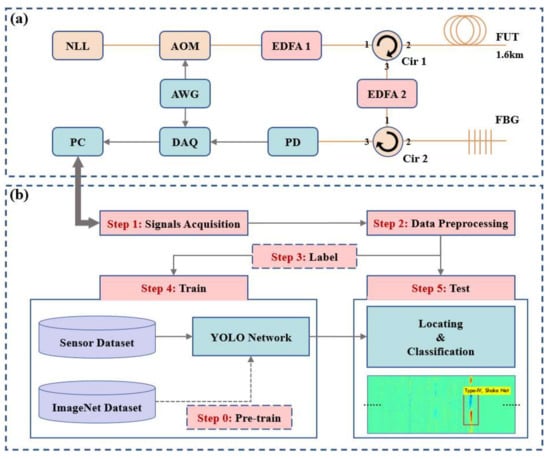 To quickly locate and classify the sensing signal, there is currently a method combining DOFS and YOLO algorithm proposed by Zhou et al. in 2021 []. They took the lead in the application of YOLO in pipeline inspection gauge detection. YOLO is a fast object detection algorithm, which can determine the bounding box and classify events at the same time in a network []. However, the method they proposed can only detect a single type of event. Therefore, different from their work, we demonstrate a new method for detecting and classifying multi-class disturbance events and achieving real-time operation, making it more suitable for practical applications.