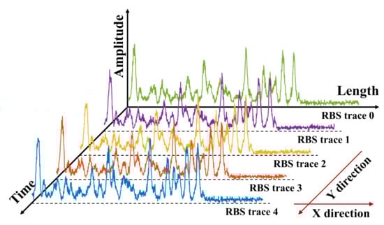 After using a photodetector to convert the optical signal into an electrical signal, the DAQ is used for data collection. The one-dimensional sensing data is subsequently converted to spatial–temporal sensing matrix as shown in Figure 2, whose horizontal axis direction is the spatial domain, and the vertical axis direction is the time domain. The moving average method is adopted to suppress the random noise of the raw data []. We calculate the differential between two adjacent RBS traces and normalize the differential result. The processed 2D data will be stored as an image, and the amplitudes are converted into the color of each pixel. The converted images are labeled according to the type of vibration event within and stored for network training and testing.