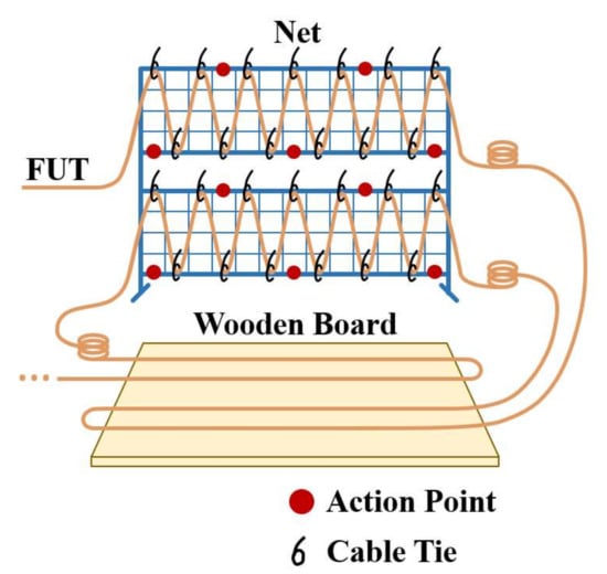To avoid that the disturbance classification is influenced by its occurrence location during disturbance detection (one FUT location corresponds to a specific disturbance type), it is necessary to decouple the disturbance type from its occurrence location. Therefore, after the data acquisition of the “cutting the protective net “(V) at each location, all the remaining ties are cut and the FUTs of other different areas are re-laid on the net and the board according to Figure 4.