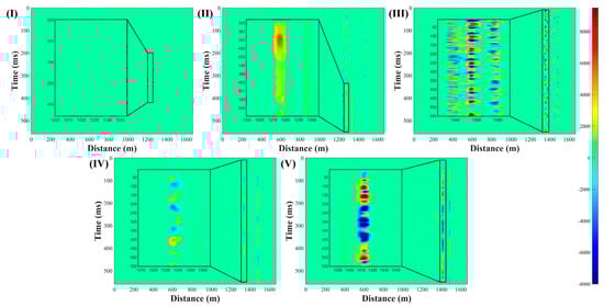 We use a hammer to hit the upper and middle beams at different positions of the metal protective net (1.4 m × 1.45 m) at a stable frequency and use random forces to simulate the impact. The regular blue–red pattern appearing in Figure 5III is consistent with the characteristics of stable frequency. The patterns appearing at 1340 m and 1380 m are caused by the FUT laying method. It can be observed that the three groups of patterns at 1340 m, 1360 m and 1380 m do not affect each other.