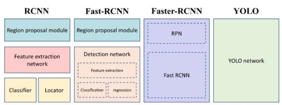 Schematic diagram of the workflow and structure of RCNN, Fast-RCNN, Faster-RCNN and YOLO.