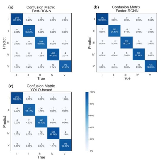 Confusion matrix of Fast-RCNN (a), Faster-RCNN (b) and YOLO-based scheme (c).