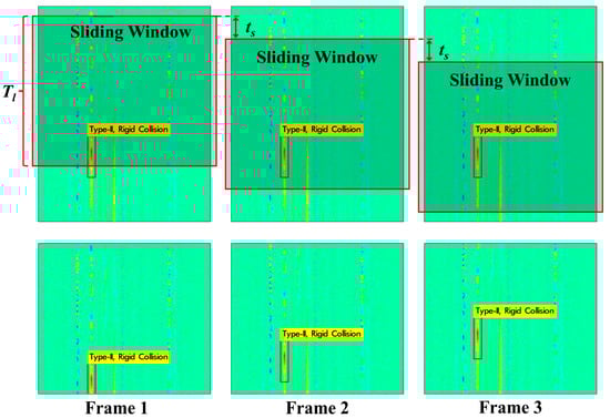 The faster computing speed achieved by YOLO meets the demand for real-time processing, so further experiments are carried out using brand new data which has not been included in the previous dataset. We use the same system parameters for continuous data collection. After slicing and pre-processing the raw data, a sensing signal up to 30 s is obtained. In order to be more suitable for industrial scenes, we converted the matrix into a video by applying a sliding window to the original signal matrix during data acquisition. A window length Tl of 0.5 s is used for 30 s video generation, as shown in Figure 8, and the frame rate of the video is 20 FPS, corresponding to a sliding step ts of 0.05 s. From the previous experiments, it can be seen that the processing time Tp for a sensing image with Tl of 0.5 s is 0.0438 s. As Tp is less than the sliding step ts between two adjacent frames, real-time operation is achieved with the proposed method.