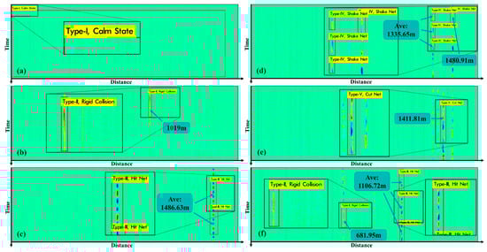The sensing video contains the above-mentioned 5 types of events, and there are situations where multiple events occur at the same time. We used the well-trained model to detect disturbance events in the video, and the detection results are shown in Figure 9. At different moments in the video, each disturbance event was detected separately. In Figure 9a, the monitoring results of the “Calm State” are presented as no other disturbing events are detected, which is in accordance with our expectation and presentation logic. In Figure 9b, a “Rigid Collision” event is detected at 1019 m of the sensing fiber (position information is obtained by mapping the coordinates of the center point of the bounding box to the actual sensing distance). In Figure 9c, the behavior of the “Hit Net” is detected twice in sensing image, and the mean value of the centroids of the two bounding boxes corresponds to 1486.63 m, and the pattern corresponds to 1484.72 m, which have a small error (1.9 m). In Figure 9d, we fixed two sections of sensing fiber at 130 m intervals to the protective net, so that the “Shaking Net” behavior was detected at 1335.65 m and 1480.91 m, respectively. In Figure 9e, we cut the tie to allow the sensing fiber that was secured to the protective net to fall and collide with the net. At 1411.81 m, our method recognizes the “Cut Net” event and does not misidentify several other patterns. The collision of the fiber with the net in the “cut net” event also affects other fibers in proximity (laid according to Figure 4). In Figure 9f, two events have been detected at the same time (“Rigid Collision” at 681.95 m and “Hit Net” at 1106.72 m), demonstrating the multi-class vibration detection ability of the proposed method. The results present that there is no missed detection of vibration events or misclassification in real-time detecting of sensing video.