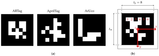 AprilTags [68,69,70] are special types of visual fiducial tags such as barcodes or QR-codes. Unlike these, which are designed for a wide range of user-defined information such as web links, product information, or prices, AprilTags are specifically designed for fast and reliable recognition and identification even at large distances. In fact, AprilTags have a special shape and appearance to make them distinguishable from each other and to contain as little data as possible so that their precise position and orientation with respect to the camera can be decoded as quickly as possible—an immanent requirement for real-time robotics application. AprilTags are squared visual fiducial tags with a black and white frame whose corners are used for pose estimation. The frame’s width corresponds to one bit. In the center of the tag, the bits are arranged according to a specific pattern, depending on the tag family. A tag family, consisting of several unique and distinguishable tags, is characterized by two numbers: the number of data bits in the center of the tag and the hamming distance between adjacent tags, i.e., the distance to avoid faulty identifications. For example, the family 36h11 is a 6-by-6 data square with a hamming distance of 11 resulting in 587 different unique tags. Figure 2b shows an AprilTag of this family.