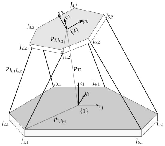 Consider a parallel mechanism such as the Stewart–Gough platform (shown in Figure 3) consisting of a fixed base platform, a moveable manipulator platform, base and manipulator platform joints, as well as six linear actuators. Each platform has its own body-fixed coordinate system including the base platform and the manipulator platform . The vector from the center of the platform to the fulcrum of the kth joint of platform is denoted as and the connection vector between the joints and of platforms and as with . Using inverse kinematics, this vector is given by